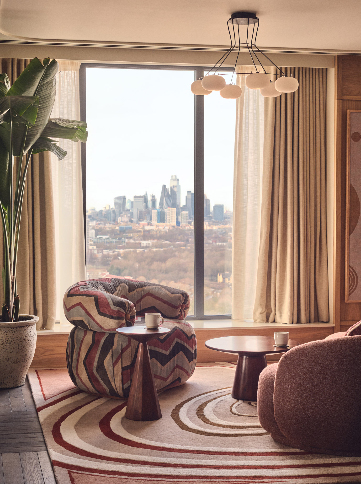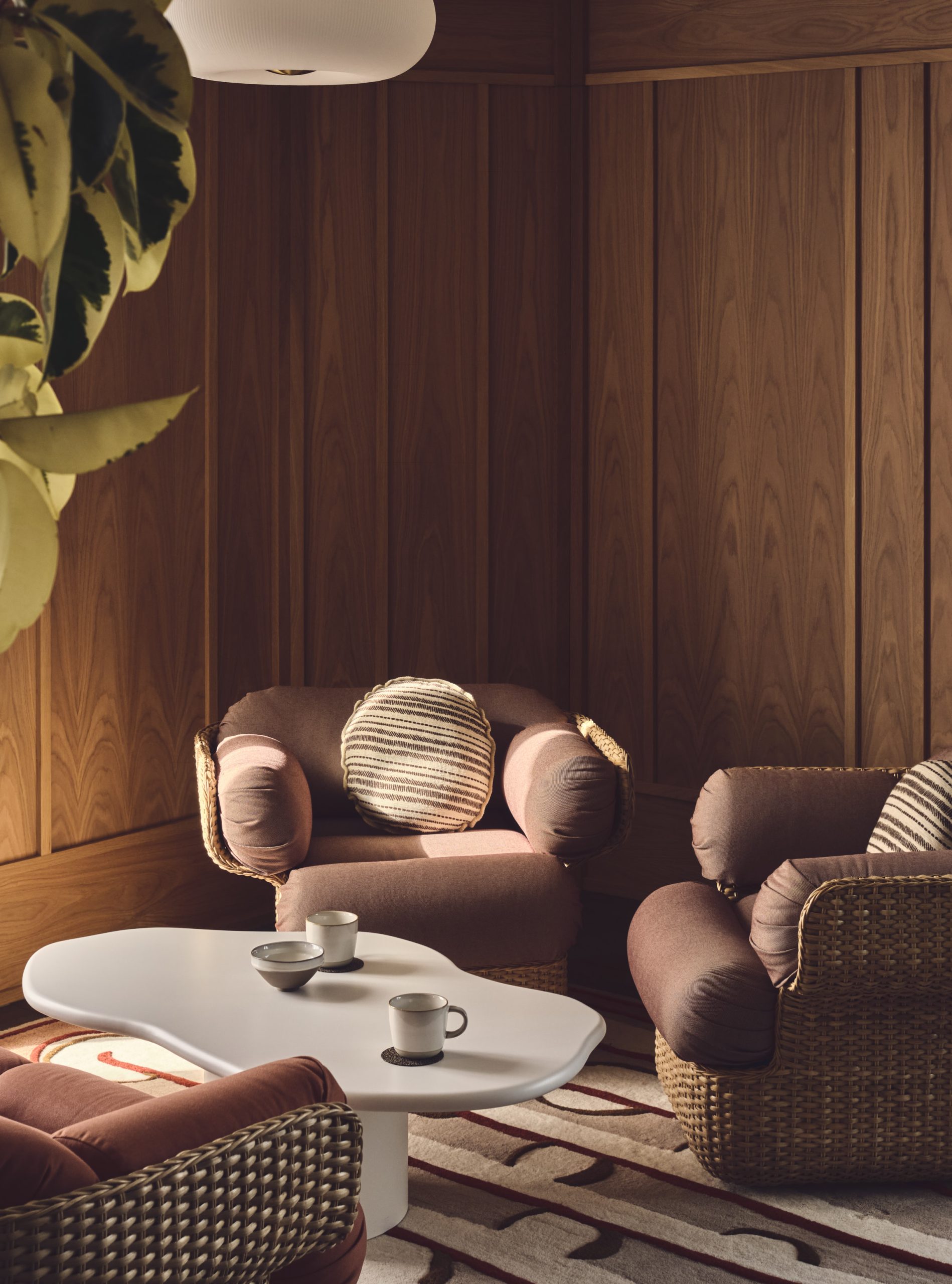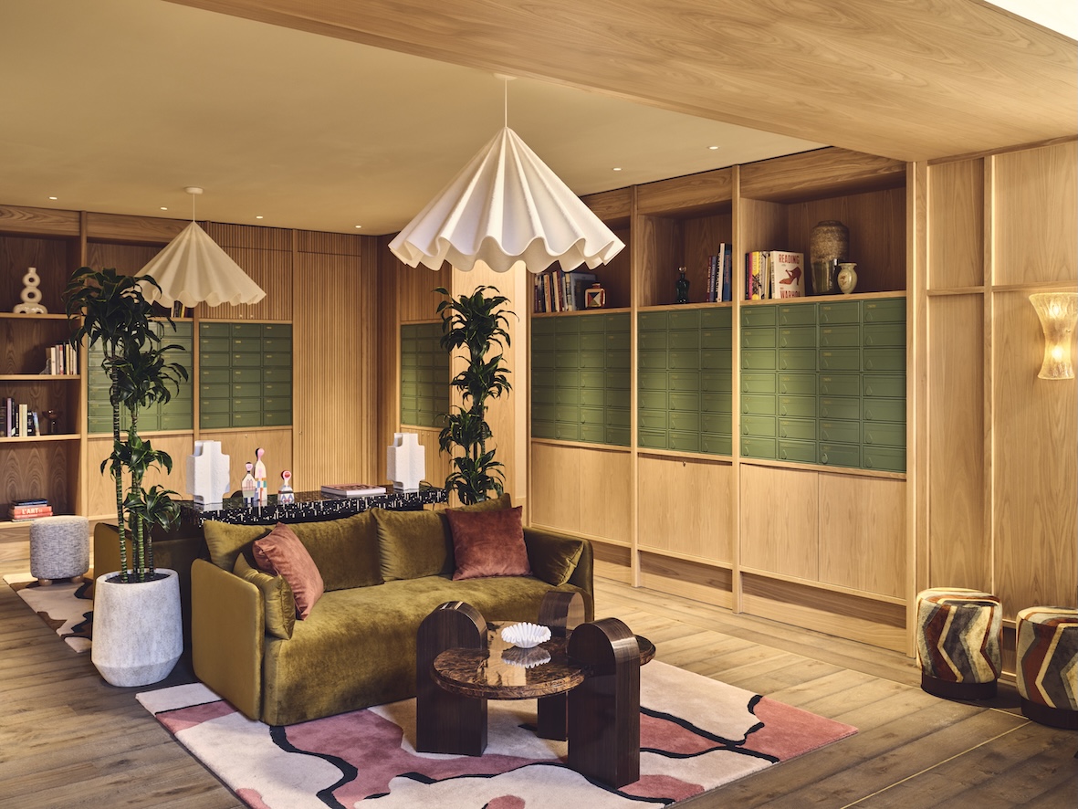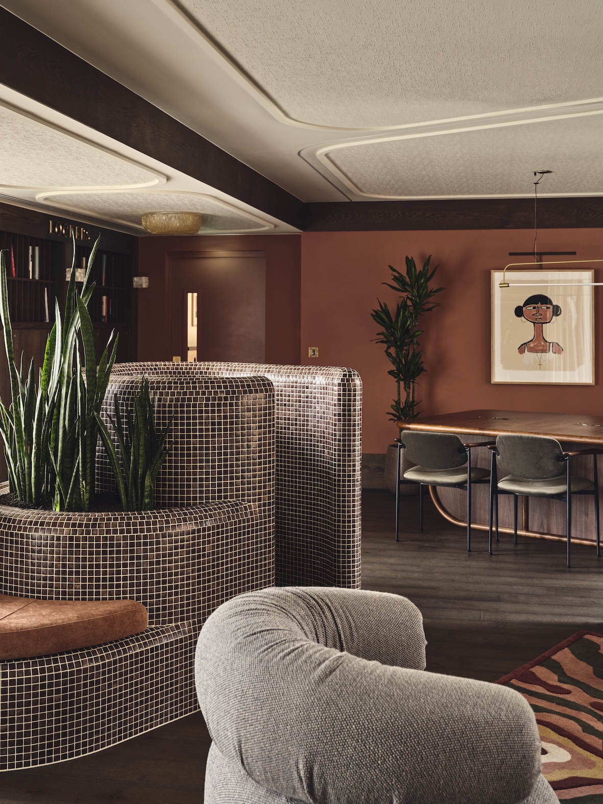 La visión de ADC & Tuneu para el edificio celebra la honestidad material, la presencia de vegetación y la interacción social. El diseño interior se inspira en la herencia brutalista de Londres, especialmente en el Barbican y sus terrazas ajardinadas. Una paleta terrosa de materiales naturales, panelados de madera y tonos neutros suaves aporta calidez a la arquitectura, mientras que asientos de perfil bajo, sofás curvos icónicos y alfombras y textiles a medida evocan la atmósfera de un club privado dentro de un entorno residencial. Cortinajes cuidadosamente seleccionados, luz natural y una abundante vegetación dotan a los interiores de una sofisticación serena, dando lugar a una expresión contemporánea de la vivienda, tranquila y arraigada.