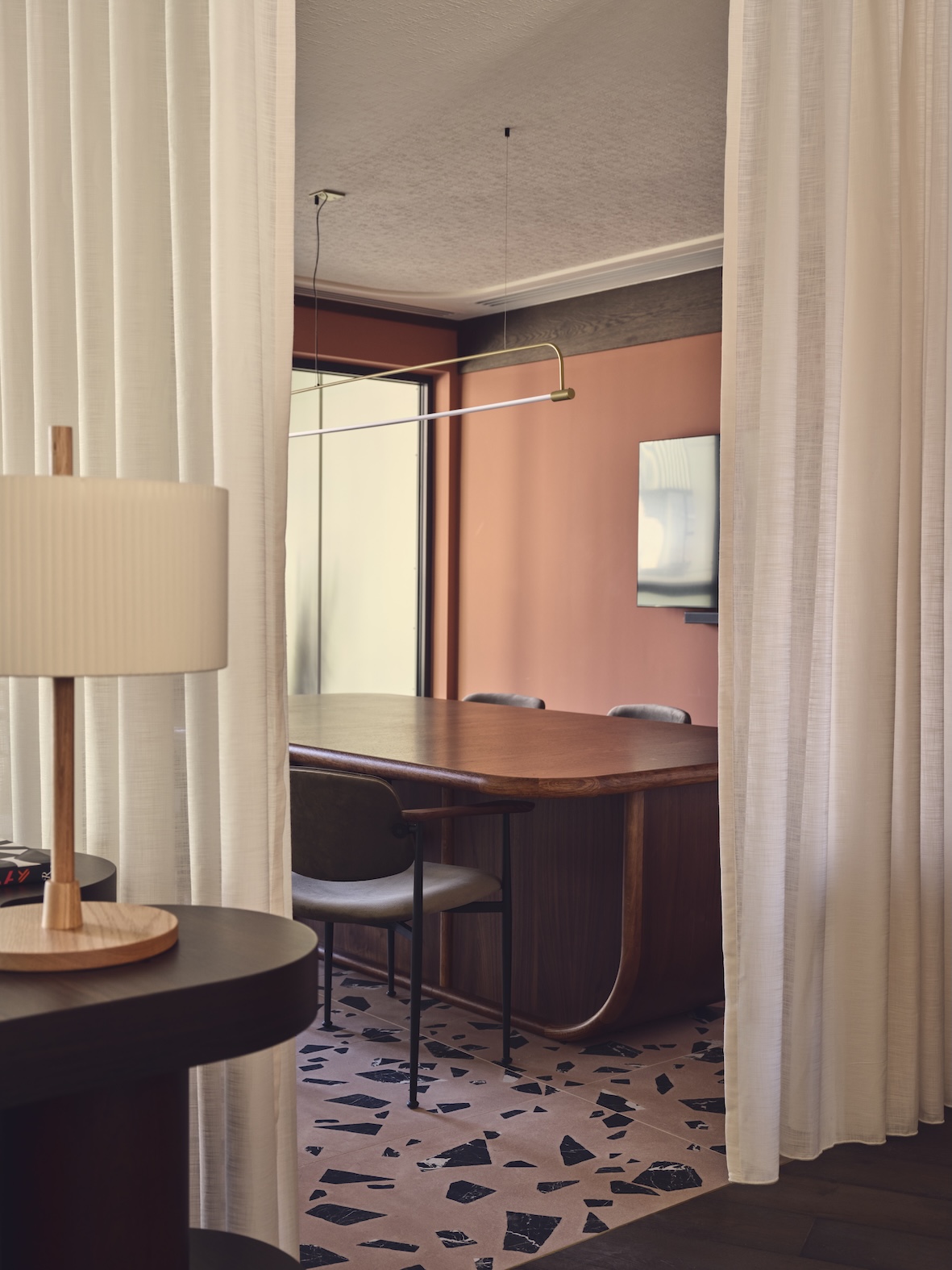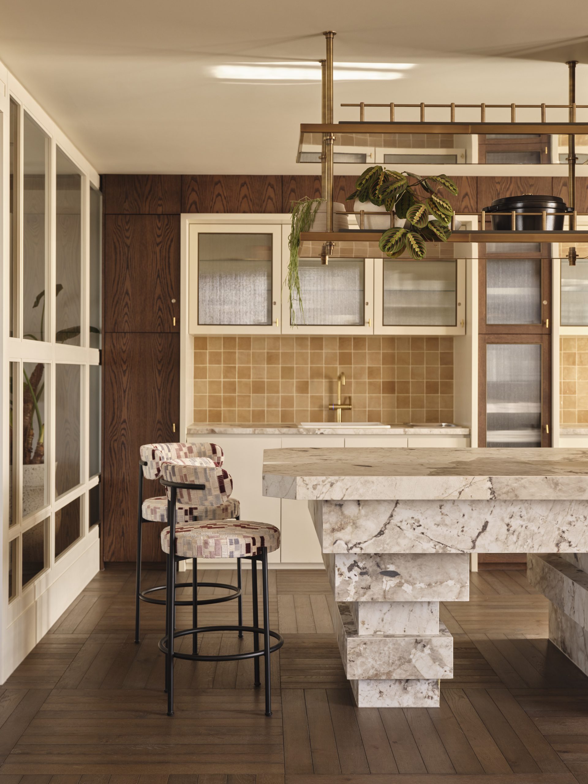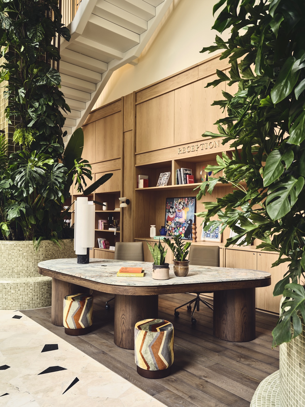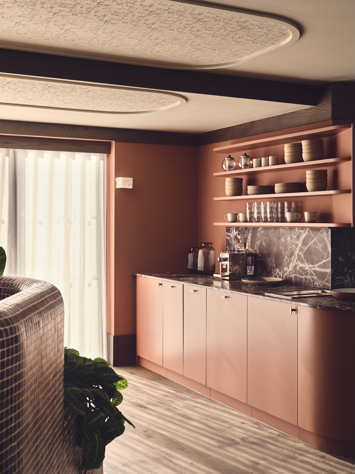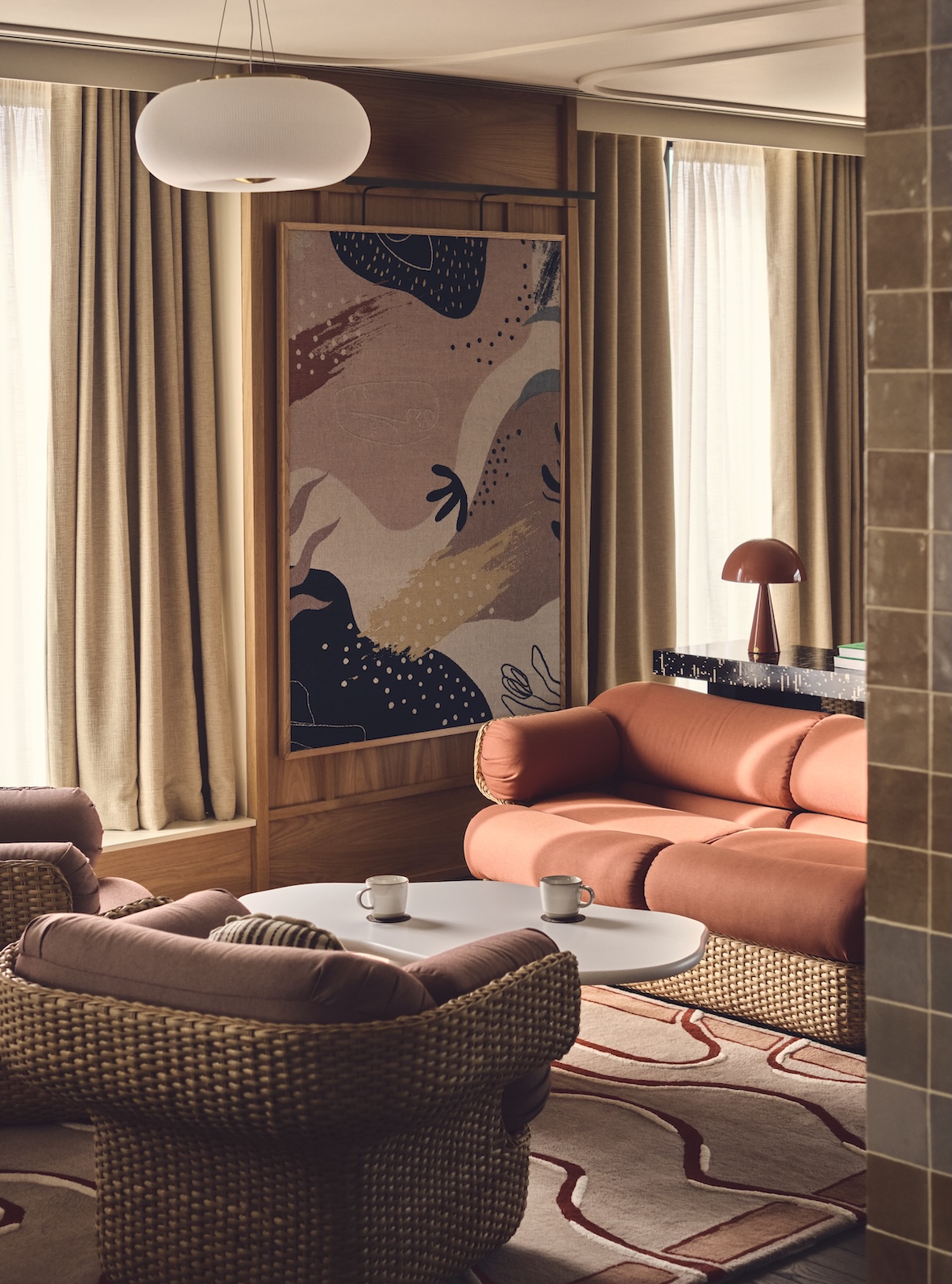 La visión de ADC & Tuneu para el edificio celebra la honestidad material, la presencia de vegetación y la interacción social. El diseño interior se inspira en la herencia brutalista de Londres, especialmente en el Barbican y sus terrazas ajardinadas. Una paleta terrosa de materiales naturales, panelados de madera y tonos neutros suaves aporta calidez a la arquitectura, mientras que asientos de perfil bajo, sofás curvos icónicos y alfombras y textiles a medida evocan la atmósfera de un club privado dentro de un entorno residencial. Cortinajes cuidadosamente seleccionados, luz natural y una abundante vegetación dotan a los interiores de una sofisticación serena, dando lugar a una expresión contemporánea de la vivienda, tranquila y arraigada.