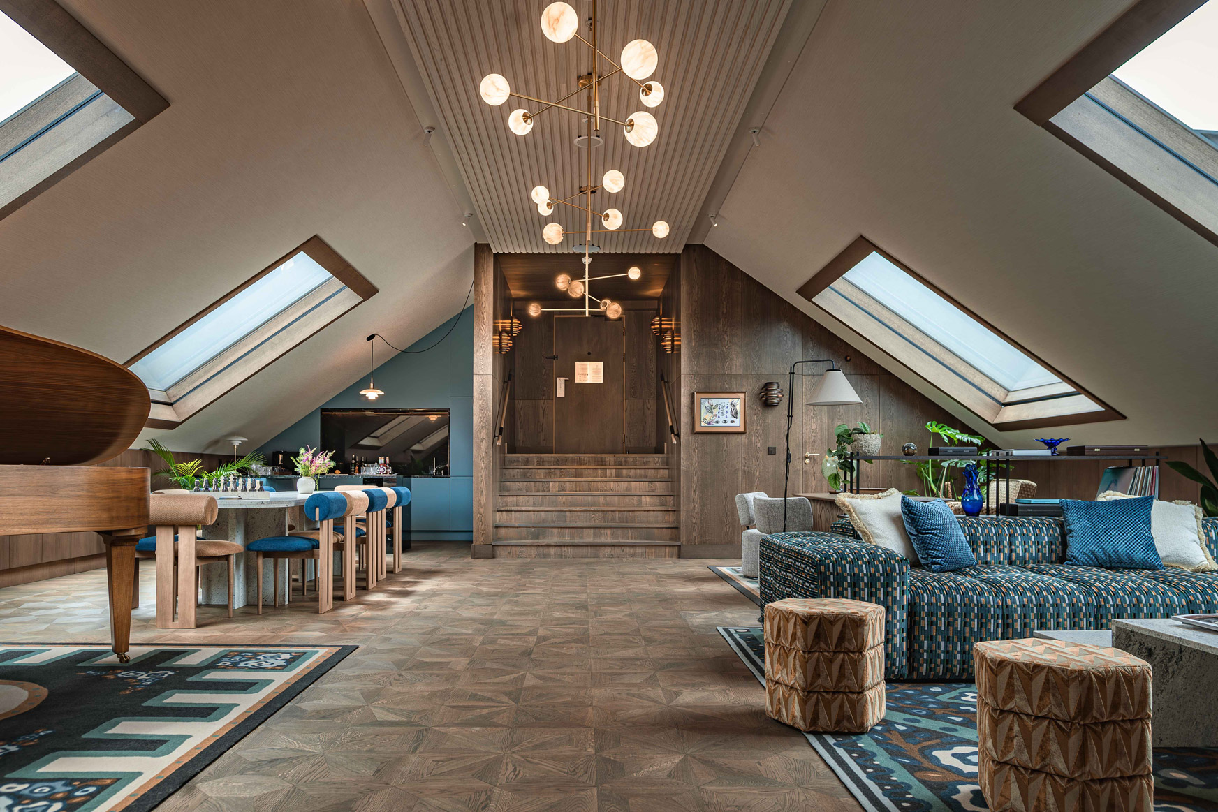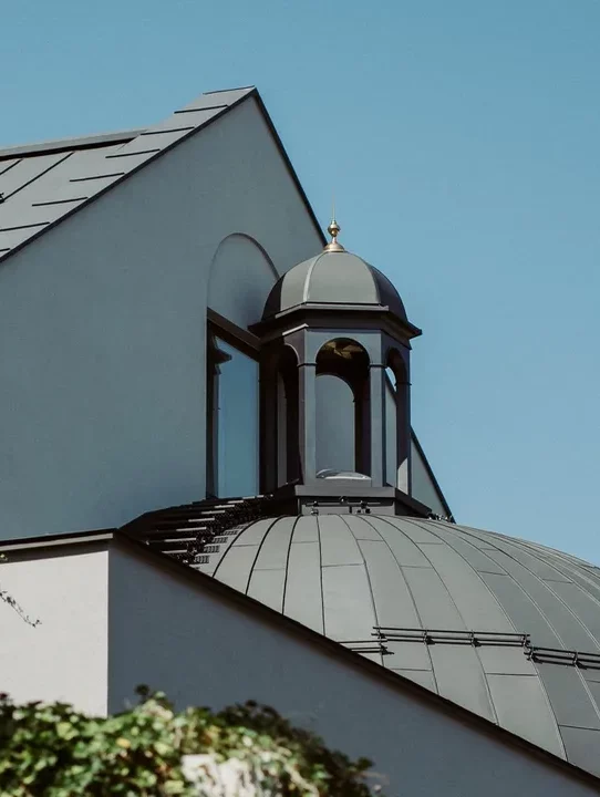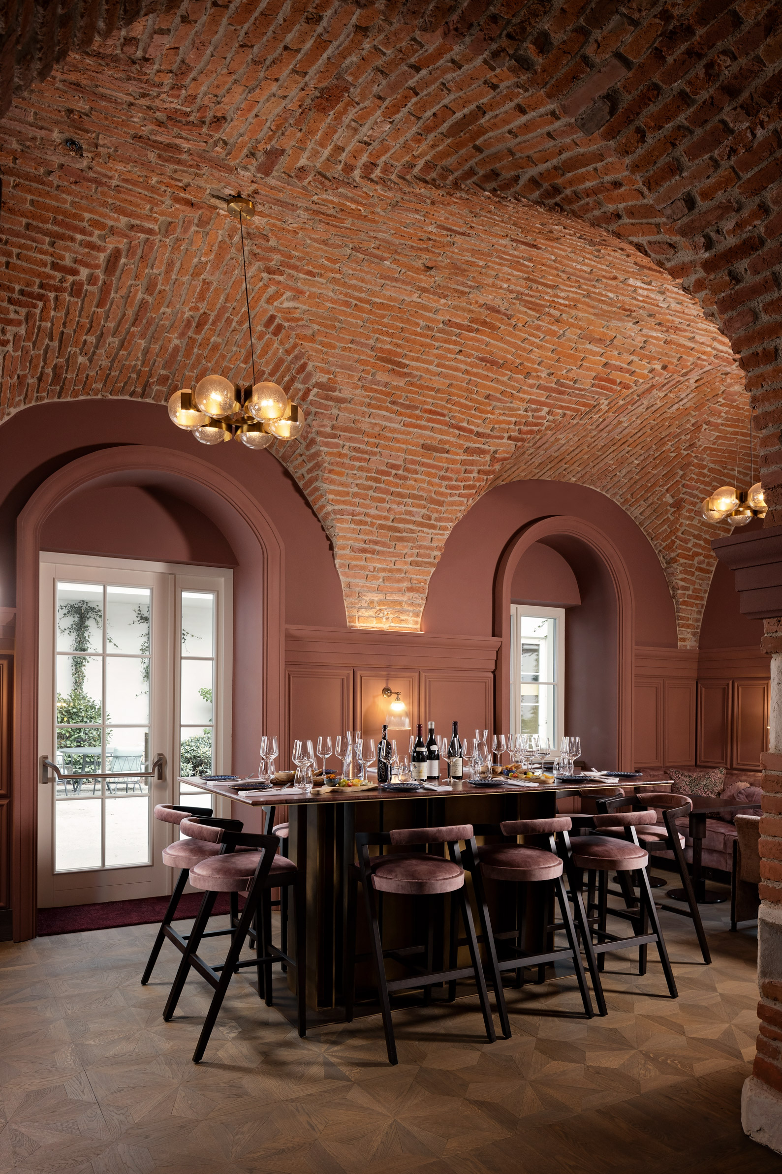 Inspirados en los característicos tejados de Cracovia, los interiores incorporan tonos patinados de azul y verde, mientras que la barra principal refleja el ritmo de los arcos de la capilla. En el transepto adyacente, un bar de vinos se sitúa bajo la estructura de ladrillo visto, generando un diálogo entre épocas. Mobiliario y textiles de origen local conviven con obras contemporáneas de destacados artistas polacos, dando forma a un espacio donde historia y cultura actual coexisten con una sofisticación serena.